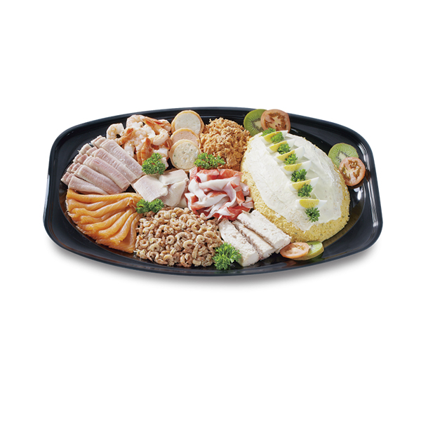 bestaat uit: zalmsalade, stukje makreel, gerookte palingfilet, gerookte zalm, krabvlees, Hollandse garnalen, cocktail garnalen, heilbotpaté, gerookte forelfilet, warm gerookte zalm.