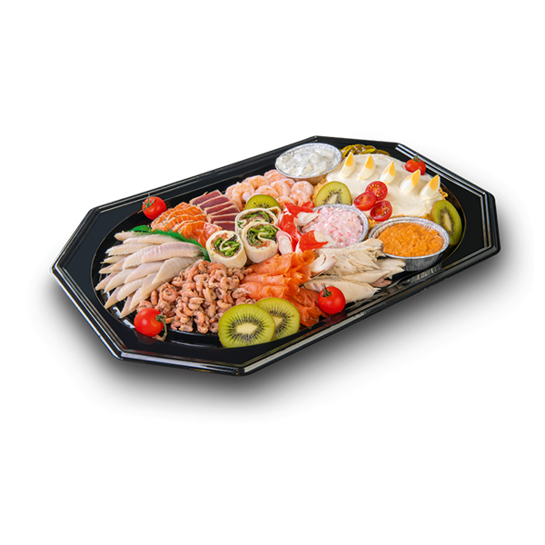 Bestaat uit: zalmsalade, stukje makreel, gerookte palingfilet, gerookte zalm, krabvlees, Hollandse garnalen, cocktail garnalen, pure zalm, krabsalade, haring in dille, zalm- en tonijntataki, zalm wrap